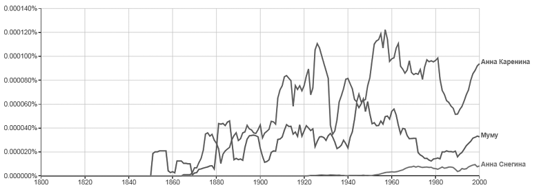 Рис. 1. «Карьеры» популярности персонажей художественных произведений Анны Карениной, Муму и Анны Снегиной в русскоязычной среде Google Books (1800-2000 гг.).
