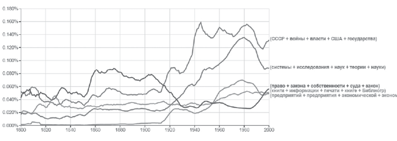 Для доказательства или опровержения таких описаний современности, как, например, «экономический подъем капитализма», необходимо изучить сравнительную динамику изменения значимости в данном обществе всех известных функциональных систем. Методологически говоря, всеобъемлющий анализ функциональной дифференциации может быть проведен с использованием инструмента Google Ngram Viewer, позволяющего строить графики временных рядов частот встречаемости слов, содержащихся в крупнейшей в мире базе данных оцифрованных книг Google Books. Она содержит более 67 млрд. словоупотреблений на русском языке — достаточный объем социальной памяти для оценки справедливости таких больших нарративов, как секуляризация, политизация, экономизация и медиатизация (информатизация) русскоязычной среды в период 1800–2000 гг.