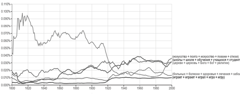 Вводя эти поисковые цепочки слов в Google Ngram Viewer, мы не следуем классическому алгоритму количественных исследований. Рассматривая результаты нашего поискового запроса, мы осознаем, что они объединяют научное обоснование с потребностью в качественных суждениях, что вызывает в памяти реминисценцию визуально схожих электроэнцефалограмм, которые также нуждаются в знаниях, основанных на опыте, и интерпретациях, прежде чем смогут стать практически полезными. Именно поэтому нашей целью не является тестирование альтернативных гипотез, таких как ослабление влиятельности религии или возрастание важности экономики в строго дедуктивном смысле. Скорее, мы пытаемся проверить наши ожидания, касающиеся того, что частота встречаемости комбинаций ключевых слов, относящихся к 10 функциональным системам, будет неравномерно распределена и подвержена изменениям во времени, и что обычно предполагаемые на уровне здравого смысла тренды секуляризации или перехода к капиталистическому обществу будут как-либо отражены в русскоязычной среде крупнейшего в мире языкового корпуса.