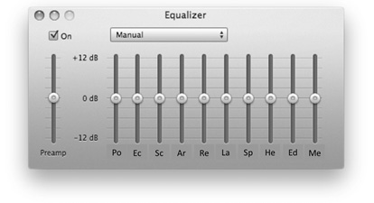 Рис. 3. Эквалайзер (Equalizer) функциональных систем политики (Po), экономики (Ec), науки (Sc), искусства (Ar), религии (Re), права (La), спорта (Sp), медицины (He), образования (Ed) и медиа (Me) в режиме ручного управления (Manual) с возможностью предусиления звука (Preamp) (измененная версия скриншота эквалайзера OS X Mountain Lion компании Apple Inc).