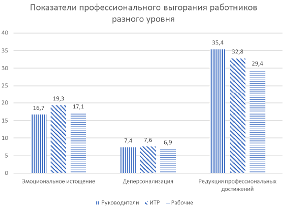 Рассмотрим профессиональное выгорание работников в зависимости от занимаемой должности и специфики деятельности: руководителей, ИТР и рабочих. Результаты исследования представлены на рис. 1.