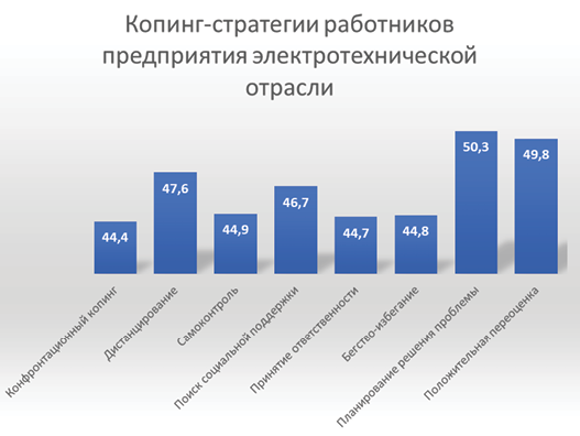 В связи с тем, что по уровню профессионального выгорания одно из предприятий, относящееся к электротехнической отрасли, отличается повышенным уровнем редукции профессиональных достижений, рассмотрим материалы, полученные на нем. Способы совладания со стрессом, диагностированные у работников этого предприятия (г. Рязань), представлены на рис. 3.