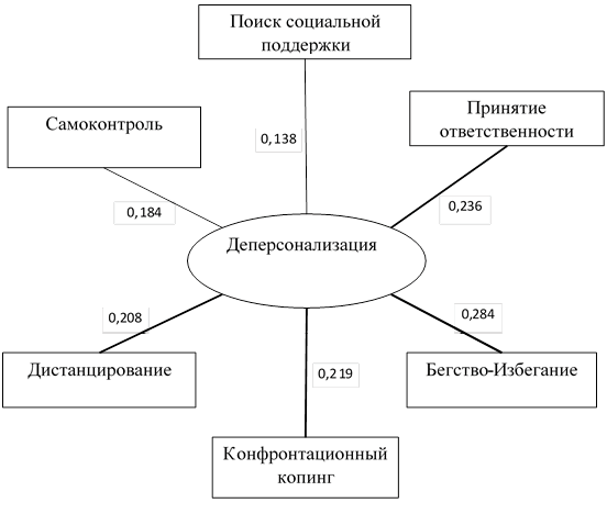 Взаимосвязь деперсонализации — показателя профессионального выгорания — с копинг-стратегиями проиллюстрирована на рис. 6.