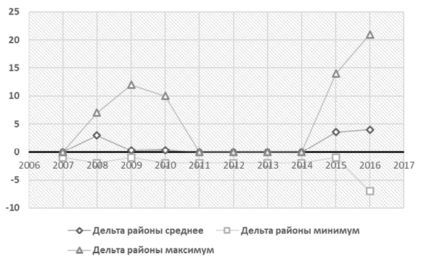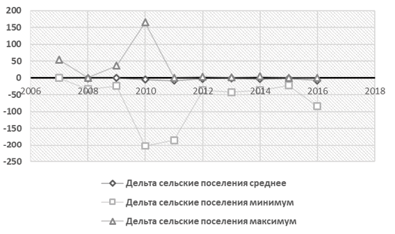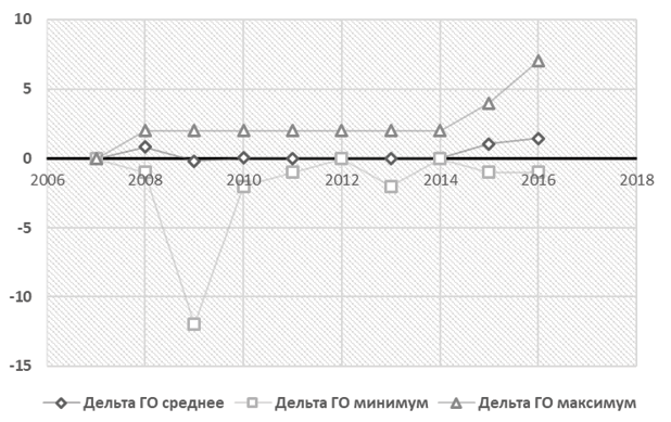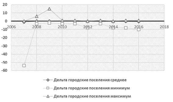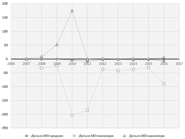 Статистика демонстрирует, что никакого единообразного процесса в стране не происходит, данные по 79 регионам за период с 2006 по 2016 г. показывают, что медиана, а также верхний и нижний квартили близки к нулю, как и средние значения. Минимальные и максимальные показатели довольно сильно разбросаны (рис. 1), причем наиболее радикальные примеры сокращения или же, наоборот, создания МО приходятся на период 2009–2011 г. Заметна общая тенденция отрицательной динамики среднего показателя с 2014 г. По факту за этот временной отрезок в целом по муниципальным образованиям наблюдается лишь 8 статистических выбросов (Псковская, Тульская, Костромская, Нижегородская, Вологодская и Новгородская области, а также Чукотский АО и Карелия), все остальные субъекты РФ находятся в рамках общего процесса в сторону незначительного постепенного сокращения от 1 до 7 муниципальных образований в год в среднем.