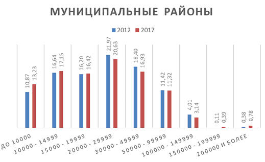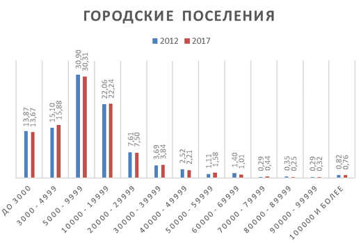 Схожую динамику нам показывает демографическая статистика (рис. 4 и 5): сокращение численности районов и поселений, прирост в доле малых сельских поселений — население сельской местности и малых городов сокращается либо естественным путем, либо путем преобразования муниципальных районов в городские округа, о чем нам говорит рост доли малых городских округов. В то же время растет доля крупных сельских поселений (рост на 0,6%). Новые исследования соотносят этот тренд с укрупнением сельских поселений. Данная статистика не демонстрирует нам полной картины, так как Росстат начал публиковать эти данные только с 2012 г., однако общие тенденции последних лет (которые, как минимум, связаны с текущими законодательными инициативами по «упразднению поселенческого уровня») вполне заметны.