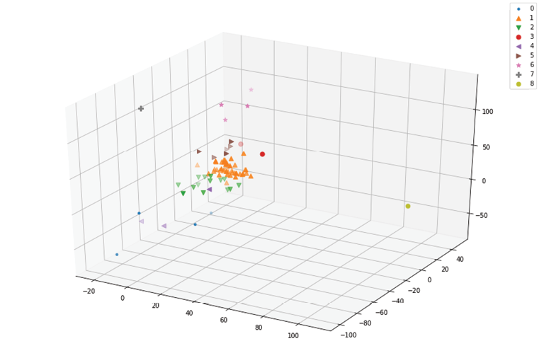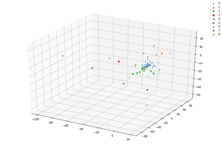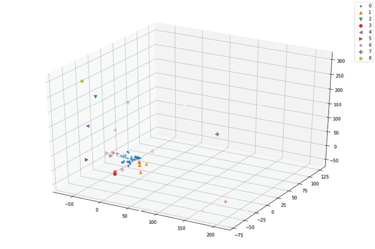 За период 1987–1995 гг. была использована выборка из 77 регионов России и данные по городам районного значения, сельсоветам и поселкам городского типа (т. е. тем АТЕ, которые впоследствии станут поселенческим уровнем МСУ). Было получено 9 кластеров (рис. 10, ось X — сельсоветы, ось Y — поселки городского типа, ось Z — города районного значения).