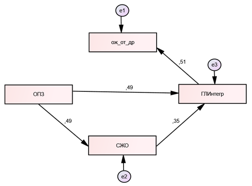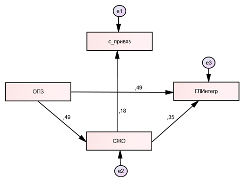 Описание диаграммы путей целесообразно начать, исходя из анализа прямого влияния предикторов на независимую переменную. Выявлен прямой эффект воздействия Личностной зрелости (ОПЗ) на Интегральную гармоничность ИГЛ (на рисунках — ГЛИнтегр), являющуюся зависимой переменной. Модель предполагает, что Личностная зрелость (ОПЗ) оказывает прямое позитивное влияние на Интегральную гармоничность (β = 0,49) и на Смысложизненные ориентации (СЖО) (β = 0,49). Директивное влияние СЖО на ИГЛ умеренное (β = 0,35), а прямое влияние СЖО на Самопривязанность (β = 0,18) заметно, но невелико. Обнаруживается косвенное влияние Личностной зрелости на Интегральную гармоничность: Зрелость влияет на Смысложизненные ориентации, которые, в свою очередь, влияют на Интегральную гармоничность (0,49) (0,35) = (0,1728). Но также заметно опосредованное влияние ОПЗ на Самопривязанность: Зрелость оказывает позитивное влияние на СЖО, которые, в свою очередь, влияют на Самопривязанность (0,49) (0,18) = 0,088. Таким образом, наблюдается двойной медиационный эффект: Зрелость посредством Смысложизненых ориентаций влияет как на ИГЛ, так и на Самопривязанность. Общее влияние переменной ОПЗ на ИГЛ довольно велико (0,6615).