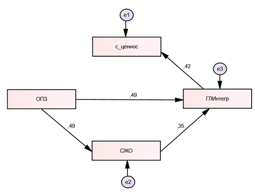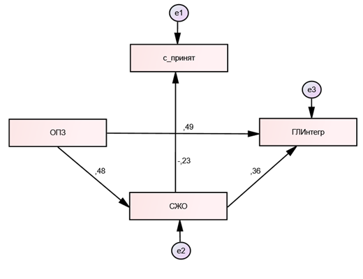 Выявлен прямой эффект влияния Личностной зрелости (ОПЗ) на Интегральную гармоничность (ГЛИнтегр), являющуюся объясняемой экзогенной переменной. Согласно спецификации модели, ОПЗ оказывает прямое позитивное влияние на Интегральную гармоничность (ИГЛ) (β = 0,49) и на Смысложизненные ориентации (СЖО) (β = 0,48). Прямое действие промежуточной каузальной переменной СЖО на ИГЛ умеренное (β =0,36), а прямое влияние СЖО на параметр Самопринятие (С_принят) методики МИС (β = –0,23) имеет умеренно выраженный отрицательный характер. Отмечается косвенное влияние Личностной зрелости на Интегральную гармоничность: зрелость влияет на Смысложизненные ориентации, они, в свою очередь, воздействуют на Интегральную гармоничность (0,48) (0,36) = (0,1723). Также выявлено опосредованное действие Зрелости на Самопринятие: Зрелость оказывает позитивное влияние на СЖО, а они последовательно негативно влияют на Самопривязанность (0,48)*(–0,23) = –0,1104. Также наблюдается двойной медиационный эффект: Зрелость посредством Смысложизненых ориентаций оказывает опосредованное действие как на ИГЛ, так и на Самопринятие. Общее влияние переменной ОПЗ на ИГЛ велико (0,6623).