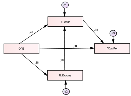 Статистики модели 5 показывают хорошее соответствие данным: χ-квадрат = 0,063 (при df = 1, p = 0,802). Как видим на диаграмме путей, общий уровень (индекс) личностной зрелости ОПЗ оказывает прямое позитивное влияние на шкалы, определяющие способность контролировать жизнь (Л_Жизнь), осуществлять волевой самоконтроль и регуляцию эмоций (ГСамРег), ощущение уверенности (С_увер) (β = 0,35). Самоуверенность, восприятие себя как волевого и надежного человека, подкрепленное позитивным влиянием (β = 0,20) уверенности в подконтрольности собственной жизни (шкала ЛК Жизнь методики СЖО), оказывают положительное воздействие (β = 0,18) на саморегуляцию (шкала методики ИГЛ). Соответственно, локус контроля жизни СЖО и черты самоуверенности МИС выступают в качестве модерирующих переменных, опосредуя влияние психологической зрелости на саморегуляцию. Уверенность в своей способности контролировать свою жизнь способствует самоконтролю эмоций и успешному решению жизненных задач.