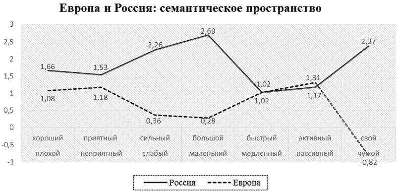 Как происходит отстройка и рефлексия образа собственной страны относительно Европы (Другого) демонстрируют данные, полученные нами при помощи методики семантического дифференциала5.