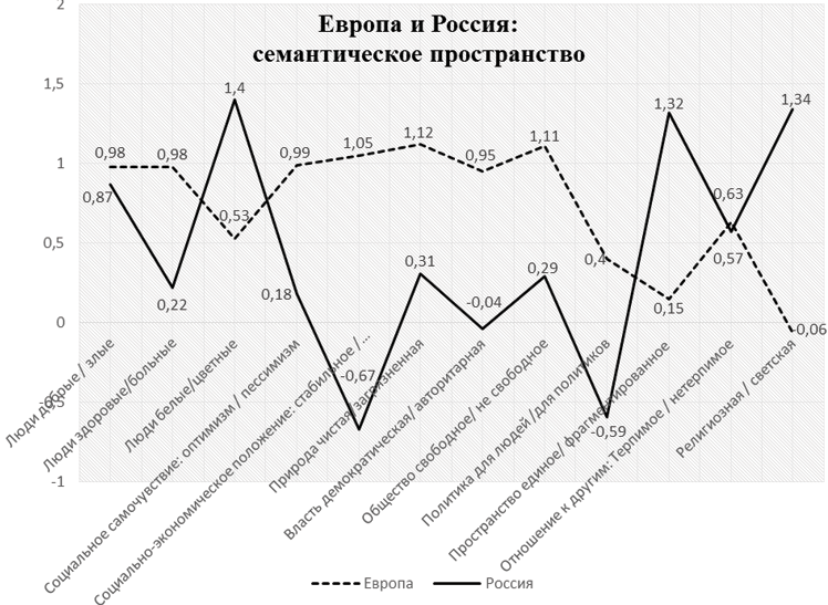 Семантический профиль Европы, описанный специализированным семантическим дифференциалом, детализирующим социально-экономические, социокультурные и политические параметры, оказался по большинству параметров выше профиля России, т. е. эти признаки получили более высокие оценки участников исследования. Более высоко (лучше, чем в России) участники исследования оценили в образе Европы людей (добрые, здоровые), социальное самочувствие, социально-экономическое положение, отметили лучшую экологическую ситуацию (в Европе — природа чистая, в России — нет), большую свободу общества, более демократичное политическое устройство, ориентированную на людей политику. Исключением оказались два признака: этническая однородность общества (люди: белые — цветные) и состояние духовной сферы (религиозная – светская). Европа воспринимается как этнически менее однородное пространство (люди цветные — 0,53), в духовной сфере — менее религиозное, светское пространство (светское — –0,06).