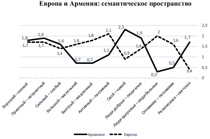Из рисунка можно видеть, что существенное отставание от Европы в сторону противоположных показателей происходит в вопросах уровня экономического благосостояния, экологии, уровня демократии, прав и свобод, а также эффективности политики. В отличие от мнения российской молодежи, в среде армянской молодежи не распространены уничижительные для образа Европы формулировки, характеризующие ее как подстраивающуюся под политику США, подстрекающую конфликтность с союзниками (в первую очередь с Россией), и т. п. Вместе с тем интересно заметить, что в дихотомии Свой – Чужой место Европе отводится армянской молодежью примерно такое же (Европа — 0,9, Армения — 2,3), как и российской (Европа — 0,8, Россия — 2,4).