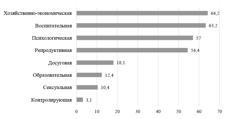 Студенты обладают соответствующим действительности знанием о функционировании семьи. Абсолютное большинство студентов уверены, что семья должна выполнять в первую очередь хозяйственно-экономическую и воспитательную функции. В тройку наиболее важных функций семьи они также включают психологическую (рис. 1). Репродуктивная функция не заняла одно из первых мест, однако значительная роль отдается воспитательной функции. Полученные данные позволяют говорить о том, что студенты, высказываясь о значимых функциях семьи, в качестве образца берут родительскую семью, где они выступают объектом воспитания. Наименее активную роль семьи студенты видят в качестве института контроля. Образовательная функция семьи была названа каждым десятым опрошенным, что вероятно связано с пересечением указанной функции с воспитательной.