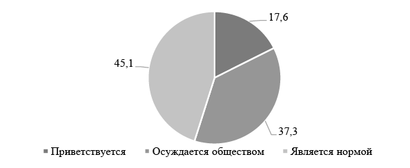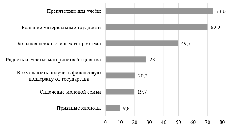 Важно понять, как студенты воспринимают оценку обществом рождения детей во время студенчества. На наш взгляд, вызывает опасение тот факт, что 37,3% студентов заявляют об осуждении обществом факта рождения детей в студенческие годы (см. рис. 2). Скорее всего такие позиции складываются из стереотипности представления об успехе и ребенке (детях) как препятствии для построения эффективной карьеры и роста благосостояния.