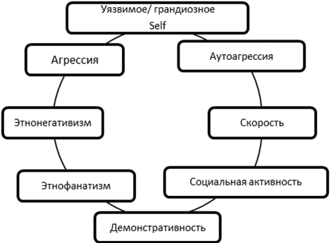 В обобщенную модель мы включили несколько факторов: уязвимое/грандиозное Self, агрессия, аутоагрессия, общий нарциссизм, этнофанатизм, этнонегативизм, демонстративность, скорость и социальная активность. Гипотеза H3 принимается.