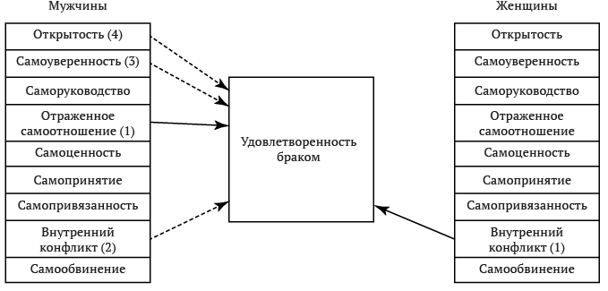 У мужчин более позитивное самоотношение (высокое самоуважение, низкое самообвинение) связано с большей удовлетворенностью браком. У женщин картина сложнее ввиду того, что отсутствие внутренних конфликтов связано с удовлетворенностью браком, но при этом некоторая степень самокритичности также положительно связана с удовлетворенностью браком.