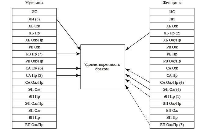 Примечание: ИС — интимно-сексуальная сфера, ЛИ — личностная идентификация; ХБ — хозяйственно-бытовая сфера, РВ — родительско-воспитательская сфера, СА — социальная активность, ЭП — эмоционально-психотерапевтическая сфера, ВП — Внешняя привлекательность, Ож — ожидания, Пр — притязания; в скобках указан номер фактора; сплошная линия — положительное влияние, пунктирная линия — отрицательное влияние.