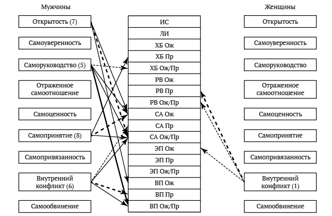 Примечание: в скобках указан номер фактора; сплошная линия — положительное влияние, пунктирная линия — отрицательное влияние; шкала «Открытость» имеет обратную хараткеристику