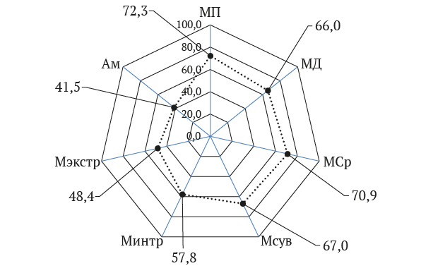 Как видно из данных, приведенных в табл. 2, получение образования в системе СПО обосновано внутренними мотивами и стремлением к самоуважению. От максимального значения каждой шкалы 20 баллов, мотивация познания (МП) составляет — 72,3%, мотивация саморазвития — 70,9%, мотивация самоуважения — 67,0% и мотивация достижения — 66,0%. На среднем и ниже среднего уровня актуальности находятся интроецированная и экстернальная мотивация (57,8 и 48,4% соответственно), а также амотивация (41,5%) (рис. 1).