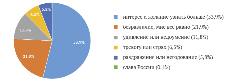 Анализ эмоционального восприятия молодежью текущих политических событий в стране выявил поляризацию мнений. Большая часть молодого поколения выражает интерес, желание быть причастными к происходящим в стране событиям (53,9%), в то время как практически четверть указала на безразличие (21,9%). Оставшаяся четверть респондентов практически в равных долях разделились во мнениях: раздражение/негодование, тревога/страх и удивление/недоумение (рис. 3). Исходя из этого, можно сделать вывод: эмоциональная реакция молодежи на политические события характеризуется поляризацией, проявляющейся в том, что молодые люди делятся условно на положительно настроенных и апатичных либо испытывающих негативные эмоции.