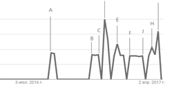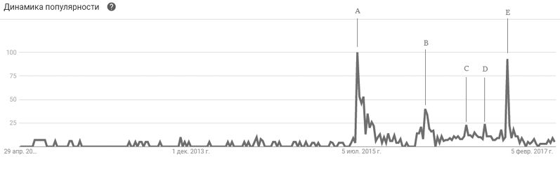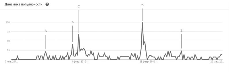 Представленный на рис. 5 график частоты запросов в поисковой системе Google, среди пользователей глобальной сети Интернет в период с января 2014 по прель 2017 г. показывает, что первый скачок (А) обусловлен согласованием и организацией шахтерами ежедневных пикетов с требованиями вернуть долги по зарплате. На протяжении всего конфликта, как видно из графика, было множество скачков, связанных прежде всего с жесткими требованиями и акциями шахтеров. Так, точки (B) и (C) отмечены началом организации голодовки (Шахтеры голодают за зарплату). Самый большой скачок отмечается в точке (D), которому способствовала ситуация, когда митингующим шахтерам запретили покидать город Гуково и Ростовскую область (Приезду ростовских шахтеров на пикет…). Остальные точки на графике характеризуют степень решения проблем, связанных с выплатами задолженности, так как выплаты происходили поэтапно и с определенными затруднениями, что порождало новый виток протестных акций.