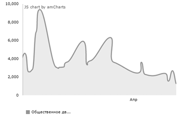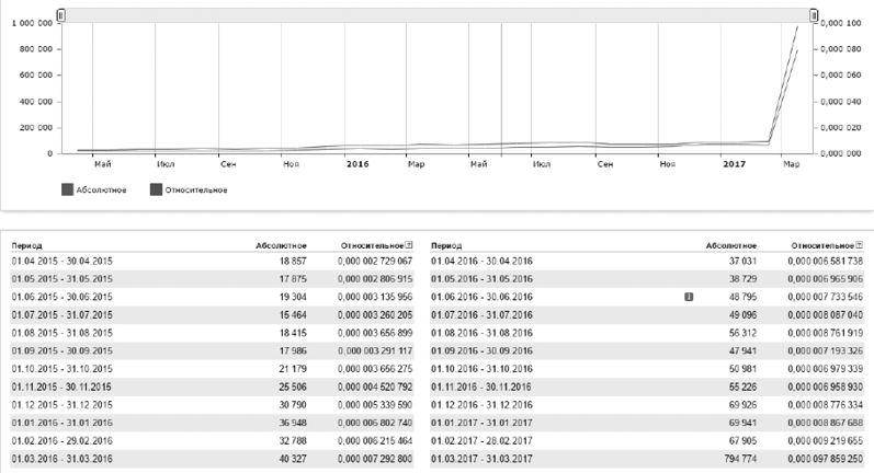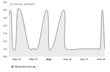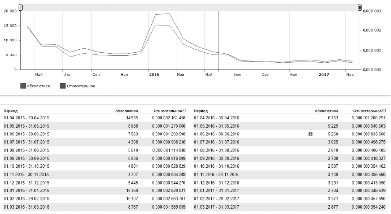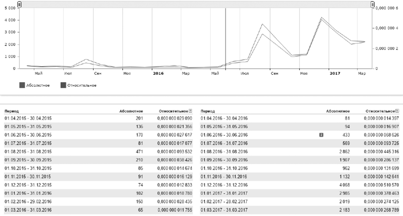 В результате исследования поисковой системы Яндекс было выявлено, что общее количество запросов со словом «шахтеры Гуково» за апрель 2017 г. составляет 1773 (рис. 6, табл. 2). Это относительно низкий результат по сравнению с предыдущими месяцами, когда проблемы шахтеров широко освещались электронными СМИ.