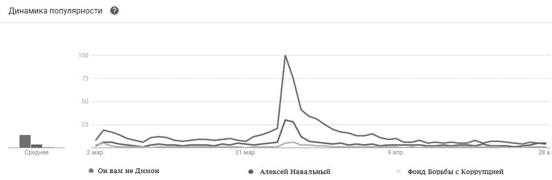 Рис. 8. Статистика Google-trends по динамике запросов по словам «он вам не Димон», «Алексей Навальный», «фонд борьбы с коррупцией»