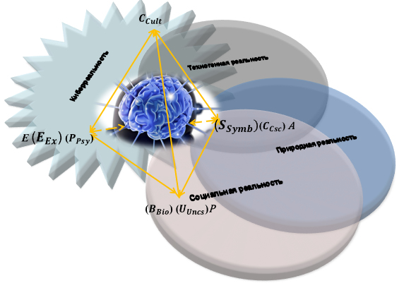 Fig. 1. The continuums of psychological interdeterminants spaces and types of reality: A — activity, Р — personality, Е — environment; B_Bio– biological; P_Psy — psychic; S_Soc — symbolic (social); C_Csc– conscious; U_Uncs — unconscious; E_Ex– existential; C_Cult — culturally conditioned