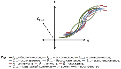 Рис. 1. Континуумы пространств интердетерминант психологической феноменологии и типов реальности: A — активность, Р — личность, Е — окружение; B_Bio– биологическое; P_Psy — психическое; S_Soc — символическое (социальное); C_Csc– осознаваемое; U_Uncs — бессознательное; E_Ex– экзистенциальное; C_Cult — культурно обусловленное