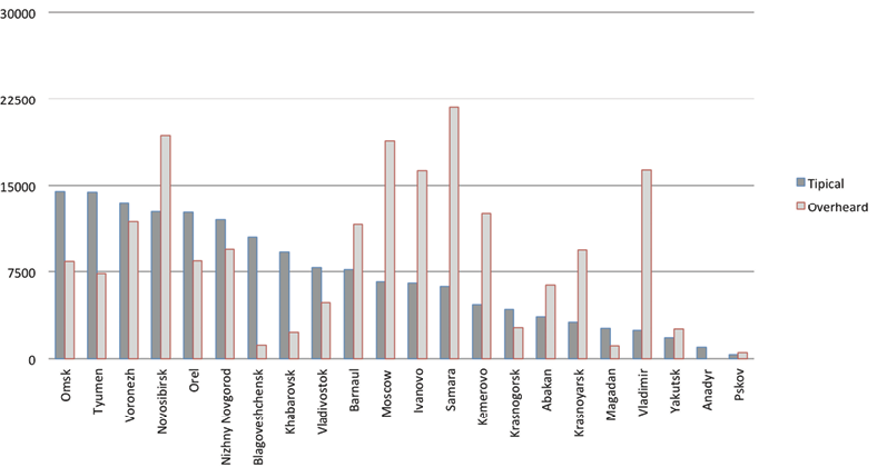 – “Civil Servants and Corruption” and its main markers: “shocking behavior of civil servants, Duma members”, “corruption and punishment”, “civil servants’ income” (for example, “Tyumen Mayor has substantially increased his income”), “bureaucracy” (for example, “minor republican civil servants restrain the development of Yakutia”). This discourse is a notable feature of the discursive field of Yakutsk, Orel, Tyumen;