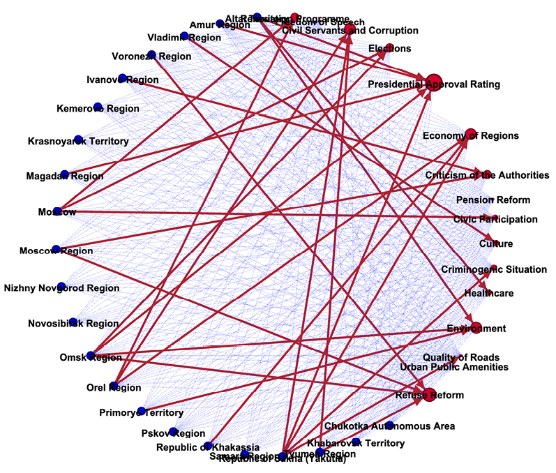 The blue color identifies the constituent entities of the RF, included in the research selection. The red color identifies the discursive fields relating to the socio-political agenda which is shaping in the given constituent entities of the RF. The linking lines as well as their thickness define which issue is current for the region. We can observe that Healthcare issue is relevant for all the 22 regions of the RF, yet it is the most prominent issue for the discursive field of Altai Territory. The discourse relating to Presidential Approval Rating is more prominent for the discursive field of Altai Territory, Amur Region, Magadan Region, Omsk Region, Republic of Sakha (Yakutia). Fugure 2 shows the vectors of the development of the discursive fields of the analyzed constituent entities of the RF.