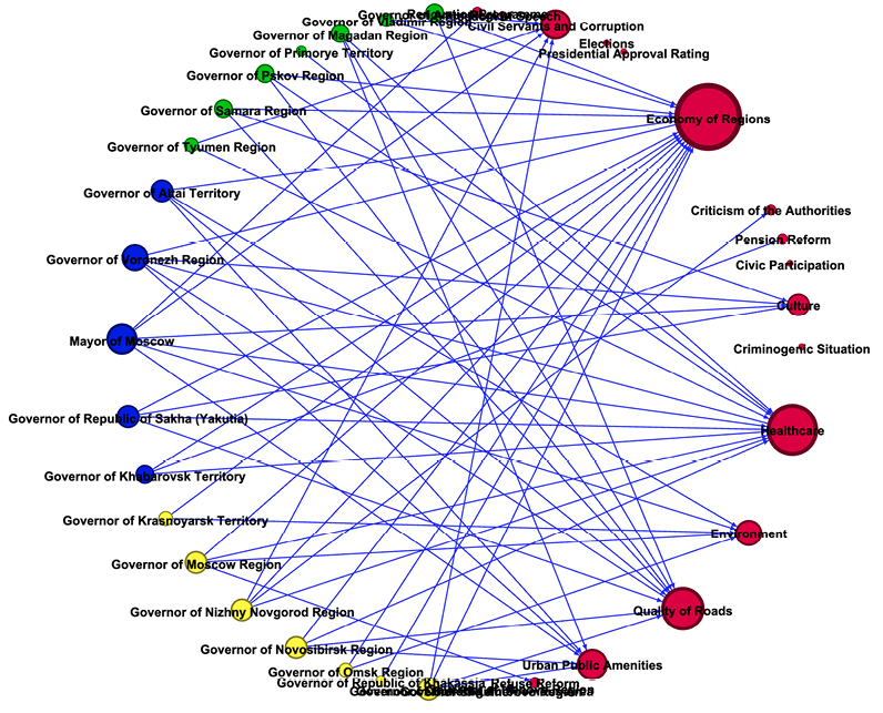 Figure 3 features the findings of network relational analysis visualized as an asynchronous multimodal discursive field “Regional socio-political agenda: governor — discourse”.