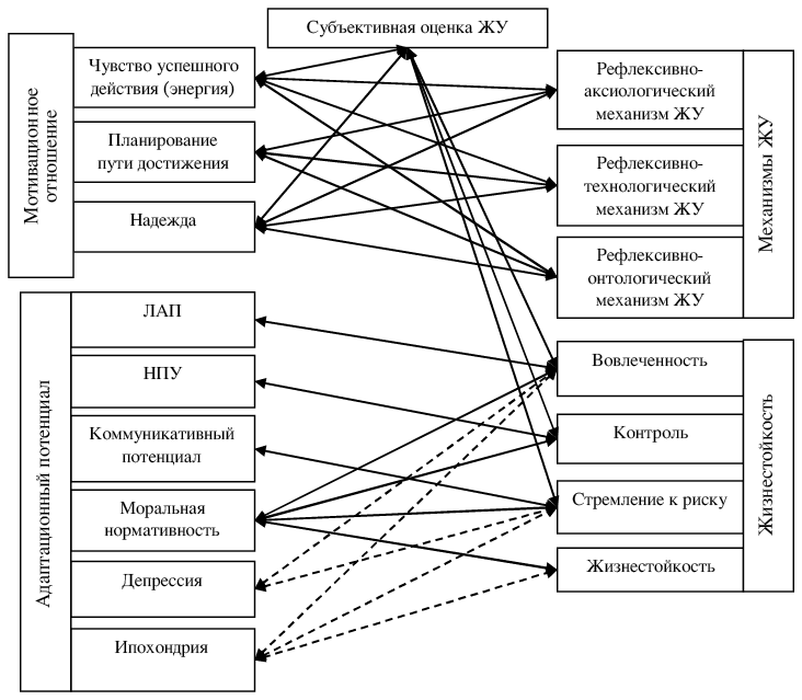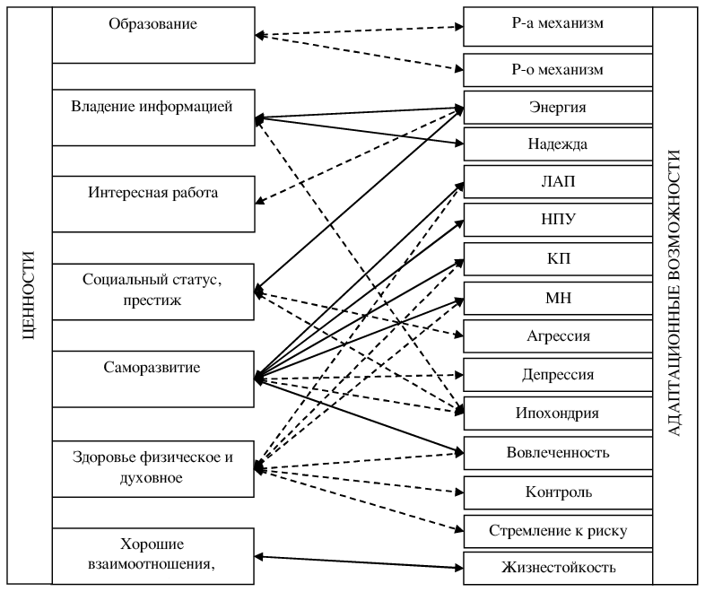 Рис. 2. Корреляционный граф, отражающий взаимосвязь показателей адаптационных способностей и ценностных оснований жизненной успешности респондентов, при р ≤ 0,01, р ≤ 0,05, где двунаправленная сплошная стрелка означает положительную значимую взаимосвязь, двунаправленная прерывистая стрелка означает отрицательную значимую взаимосвязь