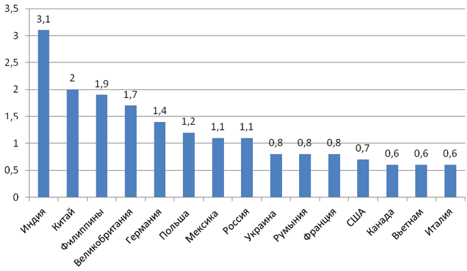 В то же время, хотя наиболее крупными донорами высокообразованных мигрантов являются страны Юга, и число стран, отдающих таланты, увеличилось, в 2015–2016 гг. среди 15 государств с наиболее многочисленными интеллектуальными диаспорами 10 — находились на Севере, где были распространены частые встречные переливы рабочей силы (рис. 1).