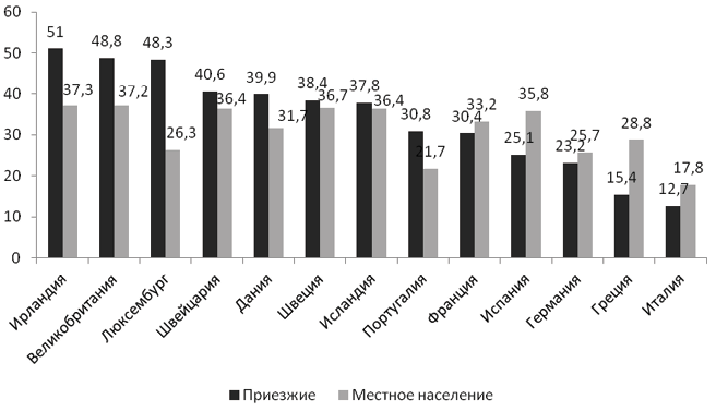 Рис. 2. Доля лиц с третичным образованием среди приезжего и местного населения в некоторых западноевропейских странах, 2018,%