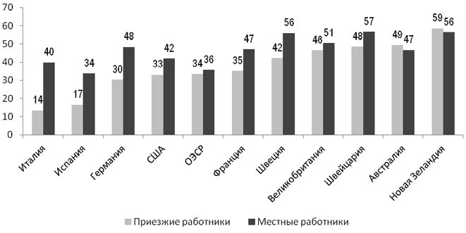 Иммиграция внесла заметный вклад в умножение квалифицированных когорт рабочей силы. За 2000–2016 гг. в государствах ОЭСР доля приезжих среди населения с третичным образованием гг. возросла с 11 до 16% (опережая динамику удельного веса мигрантов среди всего населения) (OECD,2019b, р. 2). При этом в 2015–2016 гг. в целом ряде принимающих стран она достигла внушительных размеров: в Люксембурге — 63%, Австралии — 40, Швейцарии — 35, Канаде — 29, Великобритании — 22% (и превысила долю приезжих в общем массиве жителей, зеркально отражая отмеченное выше улучшение качественного состава мигрантов) (Рассчитано по: Aiglepierre R. et al., 2020, р. 15). Весомость доли таких приезжих, представляющих собой трудовые ресурсы высокой квалификации и инновативности, составляет главный актив иммиграции. При этом зарубежные профессионалы более адаптивны и быстрее интегрируются, поскольку владеют языками международного общения, знают правила жизни и поведения в других культурных средах. По сравнению с менее квалифицированными группами работников, они отличаются гораздо более высоким уровнем занятости и более низким уровнем безработицы, больше платят в казну налогов и социальных взносов и меньше получают социальных трансфертов.