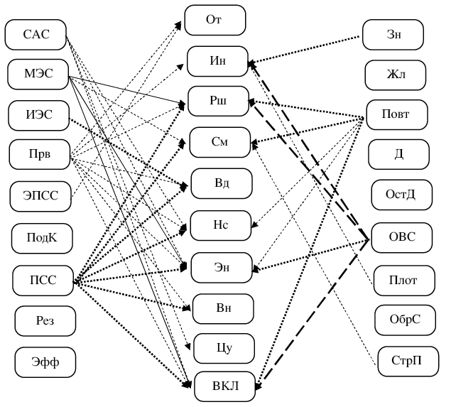 Примечание к рис. 1 и 2: САС — степень активации субъекта в ответ на ситуационные требования; МЭС — модальность эмоциональных состояний; ИЭС — интенсивность эмоциональных состояний; Зн — значимость ситуации; Жл — желательность ситуации; Повт — повторяемость ситуации; Д — давление ситуации; Ост Д — остаточное давление ситуации; ОВС — область воздействия ситуации; Плот –плотность событий; ОбрС — образ ситуации; Прв — привыкание к ситуации; ЭПСС — эффективность противодействия субъекта воздействию ситуации; ПодК — подконтрольность ситуации; ПСС — пространственная соотнесенность с ситуацией; Рез — результативность поведения; Эфф — эффективность поведенческой стратегии; От — ответственность, Ин — инициативность, Рш — решительность, См — самостоятельность, Вд — выдержка, Нс — настойчивость, Эн — энергичность, Вн — внимательность, Цу — целеустремленность, ВКЛ — общий уровень развития волевых качеств