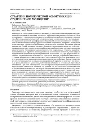 Соколов, А.В. Фролов А.А., Бабаджанян П.А. (2024). Уклонение студенческой молодежи от общественно-политической активности: причины, формы и способы вовлечения. Вестник Российского университета дружбы народов. Серия: Политология, 26(2), 389–405. DOI: 10.22363/2313-1438-2024-26-2-389-405