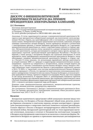 В статье характеризуется дискурс о внешнеполитической идентичности Беларуси в ходе президентских избирательных кампаний: как политические элиты воспринимают Россию и Европу, как идентифицируют себя в соотношении с внешнеполитическими силами. Эмпирический материал представляют выступления, заявления, интервью ключевых политических акторов Беларуси. Анализ проводится автором в соответствии с электоральными циклами, а именно выборами президента Беларуси, по 2 критериям: внешнеполитической ориентации на «своих» и противостоянии угрозам со стороны «других». Методологическая новизна статьи заключается в ракурсе восприятия внешнеполитической идентичности, которая рассматривается автором сквозь призму дискурса альтернативных стратегий: преимущественной идентификации Республики с Россией или Европой, а также дискурс о восприятии Беларуси как отдельной цивилизации. В статье выделяются этапы трансформации внешнеполитической идентичности Беларуси. Автор обосновывает смещение внешнеполитической идентичности Беларуси в сторону союза с Россией. В статье показано, что актуализация европейского вектора идентичности во второй половине 2000‑х гг. приводит к корректировке внешнеполитического позиционирования с акцентом на суверенность и независимость, угрозы которой видятся как с запада, так и с востока. Сложившаяся система баланса Беларуси между Западом и Россией закрепилась через посредничество Минска в урегулировании украинского кризиса в 2014 г. В 2020‑е гг. происходит слом системы внешнеполитического баланса Беларуси, которая «примыкает» к России, что признается политическими (оппозиционными) акторами и одновременно считывается ими как угроза. Руководство Беларуси, используя риторику враждебности Западу, стремится опереться на поддержку России, при этом сохраняя от нее некую автономность. К середине 2020‑х гг. доминирующей становится стратегия восприятия Беларуси как отдельной цивилизации, при сохранении стратегического союза с Россией. Ключевым официальным нарративом президентской избирательной кампании 2025 г. становится риторика сохранения мира для Беларуси.