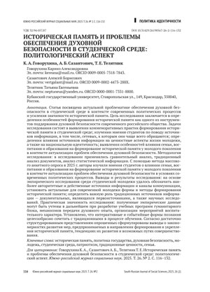 Статья посвящена актуальной проблематике обеспечения духовной безопасности в студенческой среде в контексте современных политических процессов и усиления значимости исторической памяти. Цель исследования заключается в определении особенностей формирования исторической памяти как одного из инструментов поддержания духовной безопасности современного российского общества. Задачи исследования состоят в выявлении коммеморативных практик формирования исторической памяти в студенческой среде; изучении мнения студентов по поводу источников информации, в том числе, сетевых, к которым они чаще всего обращаются; определении влияния источников информации на ценностные аспекты жизни молодежи, а также на национальную идентичность; выявлении особенностей влияния семьи, воспитания и образования на формирование исторической памяти у молодого поколения в контексте актуализации проблем обеспечения духовной безопасности. Методология исследования: в исследовании применялись сравнительный анализ, традиционный анализ документов, анализ статистической информации. С помощью метода массового анкетного опроса в 2025 г. авторы изучили мнения студентов о влиянии семьи, воспитания и образования на формирование исторической памяти у молодого поколения в контексте актуализации проблем обеспечения духовной безопасности в условиях современных политических процессов. Выводы и результаты исследования: на основе эмпирического исследования среди студенческой молодежи удалось обозначить наиболее авторитетные и действенные источники информации и каналы коммуникации, установить актуальные для современной молодежи формы и методы формирования исторической памяти; определить важную роль традиционных источников информации — документальных, являющихся первоисточниками, а также научных исследований. Практическая значимость исследования: полученные эмпирические данные могут быть учтены в дальнейшем при разработке учебных программ гуманитарного блока, механизмов передачи духовного опыта, организации мероприятий воспитательного характера. Установлено, что интерактивные и событийные формы познания целесообразно сочетать с традиционными в процессе обучения. Согласно достаточно структурированным представлениям опрошенных сформулированы выводы о закономерностях развития мер, предпринимаемых в направлении формирования и укрепления исторической памяти, тенденциях их развития и возможных путях совершенствования.