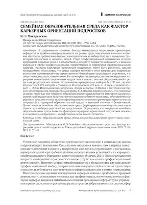 В современных условиях быстро меняющихся социальных ориентиров, дефицитов и проблем неопределенности на рынке труда актуальным является изучение факторов профессионального самоопределения и выбора будущих карьерных траекторий подростков и молодых людей. Старт профессиональной ориентации сегодня происходит довольно рано и в подростковом возрасте ожидается готовность к важным выборам в сфере профессиональных предпочтений и перспектив профессиональной карьеры. Факторы карьерных ориентаций подростков могут быть различны, однако исследования показывают, что среди лидеров мнений в этом вопросе для подростков выступают преимущественно представители ближайшего социального окружения, т. е. сверстники, педагоги, члены семьи. В статье представлены результаты исследования карьерных ориентаций современных подростков в связи с типами образовательной среды в их родительских семьях. Исследование проведено на выборке N = 96 чел., из них 48 родителей (39 матерей и 9 отцов) и 48 подростков (29 жен. и 19 муж., средний возраст — 15,63). Использовались: опросник «Якоря карьеры» Э. Шейна и методика векторного моделирования образовательной среды В. А. Ясвина. Предполагалось, что семейные условия, такие как тип семейной образовательной среды, являются фактором карьерных ориентаций подростков. В результате исследования было установлено, что современные родители создают в семье условия формирования личности преимущественно по типам творческой и карьерной образовательной среды, в меньшей степени — безмятежной. Догматическая семейная образовательная среда, формирующая пассивную и зависимую личность, в выборке родителей не представлена. Определено, что творческая семейная образовательная среда является фактором карьерных ориентаций подростков «вызов» и «служение», а карьерная — «профессиональная компетентность».