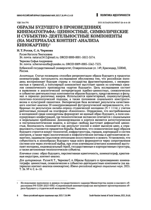 Статья посвящена способам репрезентации образа будущего в продуктах кинематографа. Актуальность исследования обусловлена тем, что российская молодежь воспринимает будущее страны и государства фрагментировано, с неуверенностью и тревогой, а популярный киноконтент выступает одним из ключевых каналов символического производства «картин будущего». Цель исследования состоит в выявлении и аналитической интерпретации идейно-ценностных, символических и субъектно-деятельностных компонентов образов будущего, представленных в фильмах и сериалах различных жанров. Теоретическая рамка состоит из идентитарного, социокультурного, политико-психологического подходов, а также положений социального конструктивизма и культурной семиотики. Эмпирическая база включает результаты качественного контент-анализа 20 кинопроизведений футурологической направленности, отобранных по результатам онлайн-опроса студенческой молодежи (N = 1116) и учета рейтинговых позиций на платформе «Кинопоиск». Определено, что востребованные в молодежной среде кинокартины формируют не единый образ будущего, а поле конкурирующих конфигураций, где технологическая экспансия сочетается с социальными и моральными проблемами. Доминирующими в корпусе являются антиутопические и постапокалиптические модели, в которых свобода выступает дефицитной ценностью, безопасность понимается как результат усилий и высокой цены, а справедливость становится предметом борьбы. Выявлено, что символическое ядро образов будущего строится вокруг технологий, инфраструктуры, городов, корпораций и систем контроля, а также через экологические и мифологические мотивы и цветосветовую семантику, задающую смысловую оппозицию искусственного и живого. Установлено, что субъектность в кинообразах будущего чаще всего формируется через сопротивление системе или через этический выбор, при этом ключевыми агентами изменений выступают молодежь, индивидуальный герой, государственные и корпоративные структуры, а также автономные технологические субъекты.