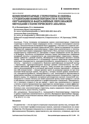 Статья посвящена исследованию оценки комплементарных стереотипов студентами в контексте теории оправдания систем с помощью многомерного анализа данных. Психологическое исследование было проведено с участием 616 студентов университетов нескольких регионов страны весной 2024 г. Целью исследования стал анализ особенностей содержания комплементарных стереотипов компетентности и теплоты, что соответствует модели содержания стереотипов С. Фиск, научным положениям о комплементарности стереотипов Д. С. Григорьева и теории оправдания систем Дж. Джоста и М. Банаджи. Научная идея программы исследования принадлежит профессору Е. В. Улыбиной. Результаты исследования показали оценку респондентами содержания измерений теплоты и компетентности как комплементарных стереотипов у вымышленных субъектов с далекой планеты, обучающихся и получающих высокие и низкие оценки. Полюс компетентности в исследовании оказался представлен выраженными качествами конкурентности, конкурентоспособности, инициативности и ума, а полюс теплоты — терпимости и искренности. Выявлена идентификация исследуемой группы с персонажами, характеризующимися высоким уровнем компетентности, что свойственно деятельной, эффективной личности. Такая ситуация для студентов представляется малоизменяемой из-за активной деятельной позиции персонажей, с которыми они себя отождествляют — меньше времени тратят на домашние задания, но при этом получают более высокие оценки, чем другие, у которых низкий уровень компетентности, конкурентоспособности, инициативности и ума. Анализируется перспективность продолжения подобных исследований для профессионального саморазвития студентов. Делается вывод, что уверенное восприятие респондентами высоких показателей компетентности и низких теплоты для своей социальной группы может привести к застою в собственном личностном развитии и профессиональном становлении. Убежденность, что у типичного студента и так все хорошо — много ума, компетентности и прочего, а теплота остается принадлежностью характеристик малоактивных и менее эффективных лиц, может привести к потере эффективности в своем профессиональном будущем.