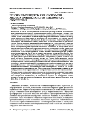 В статье рассматривается методология расчета индексов, используемых в настоящее время для оценки и сравнения пенсионного обеспечения в разных странах, а также построенные на основании индексов международные рейтинги пенсионных систем. Целью исследования является определение аналитического потенциала пенсионных индексов, их объективности, возможностей использования для анализа российской системы пенсионного обеспечения. В современном мире обостряются проблемы пенсионного обеспечения населения, усиливается разбалансированность пенсионных систем. В числе основных вызовов для пенсионных систем — долгосрочный тренд старения населения, интенсивные изменения на рынке труда, финансовая нестабильность, риски долгосрочного инвестирования пенсионных накоплений. В этих условиях повышается значимость объективного анализа параметров пенсионных систем, сравнительной оценки систем пенсионного обеспечения и проводимых пенсионных реформ в разных странах. Одним из инструментов анализа и оценки пенсионных систем являются композитные индексы. Автор рассматривает пенсионные индексы Allianz Pension Index (API), Melbourne Mercer Global Pension Index (GPI), Natixis Global Retirement Index (GRI). В статье представлена сравнительная характеристика построенных на основе индексов страновых рейтингов пенсионных систем и места в них России. Особое внимание уделено социально-экономическим и демографическим факторам, влияющим на достаточность размеров пенсии и долгосрочную устойчивость систем пенсионного обеспечения. Анализируются рекомендации разработчиков индексов по реформированию систем пенсионного обеспечения в разных странах. Представлены выводы о возможностях и методологических ограничениях применения различных интегральных индексов для анализа и ранжирования пенсионных систем. По результатам исследования высказываются также предложения по совершенствованию инструментария анализа пенсионных систем.